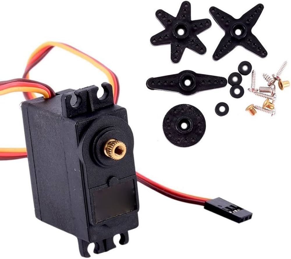 With heavy-duty materials, this High-torque metal gear servo motor is built to last. To complete a 60º movement it responds quickly and precisely in just 0.17 seconds at 4.8V and 0.14 seconds at 6V.